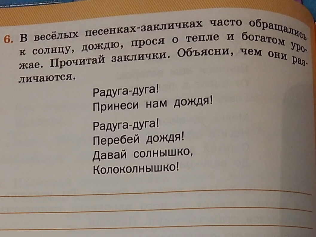 В первой закличке, просят дождь. Чтобы поля полил. А во второй просят солнышко, чтобы согрело.