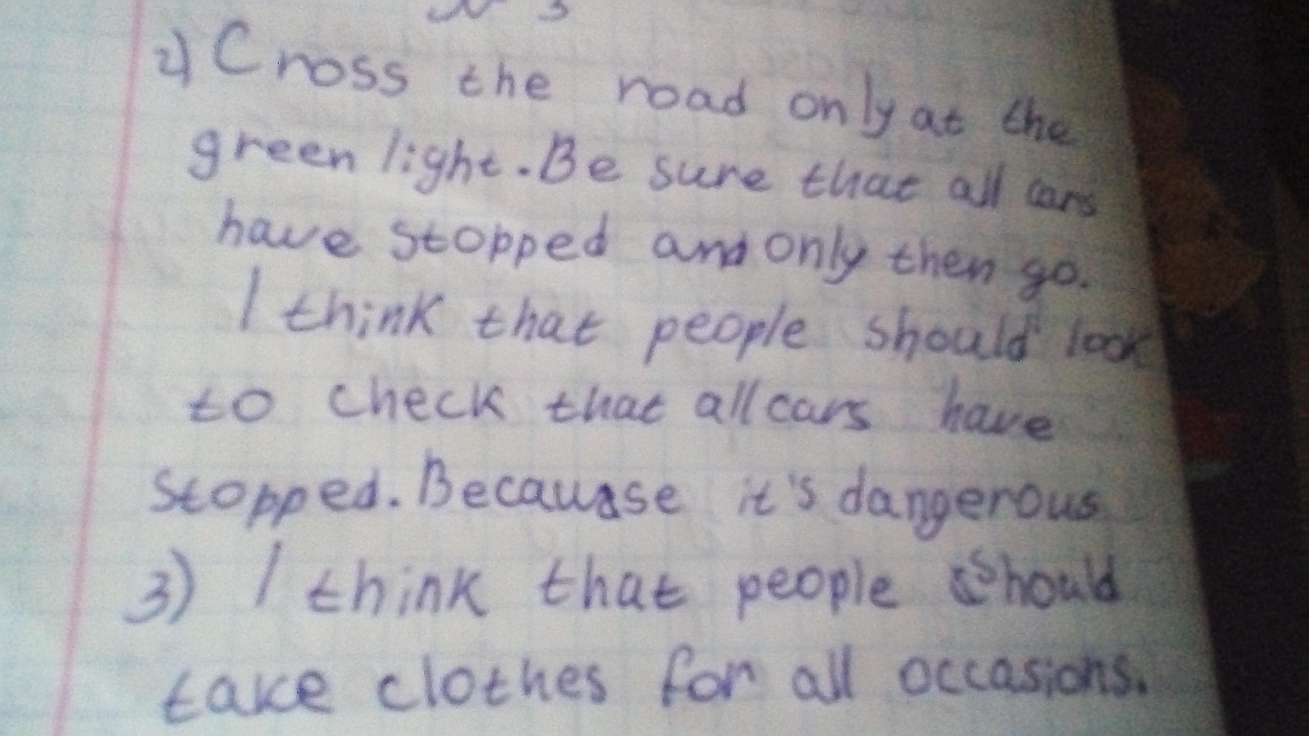 1. Кросс зэ рОуд Онли эт зэ грин лайт. Би шУэ зэт ол карз хэв стопд энд Онли зэн гОу. Ай синк зэт пипл шуд лук ту чек зэт ол карз хэв стопд. БикОз итс дЭнджирэс.