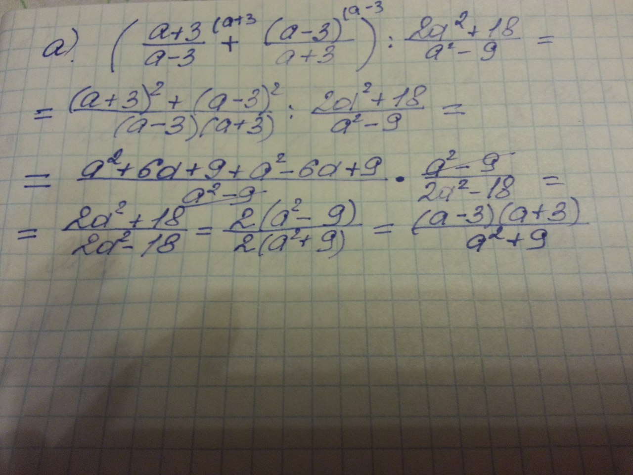 1)(((a+3)*(a+3)+(a-3)*(a-3))/(a^2-9))/((2a^2+18)/(a^2-9))=((a^2+3a+3a+9)+(a^2-3a-3a+9))/(a^2-9))/((2a^2+18)/(a^2-9))=((2a^2+18)*(a^2-9))/((a^2-9)*(2a^2-18))=-1