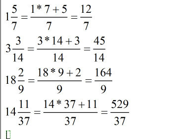 Помогите решитьпредставьте числа в виде неправильных дробей 1целое 5/7; 3целых 3/14; 18целых 2/9; 14целых 11/37