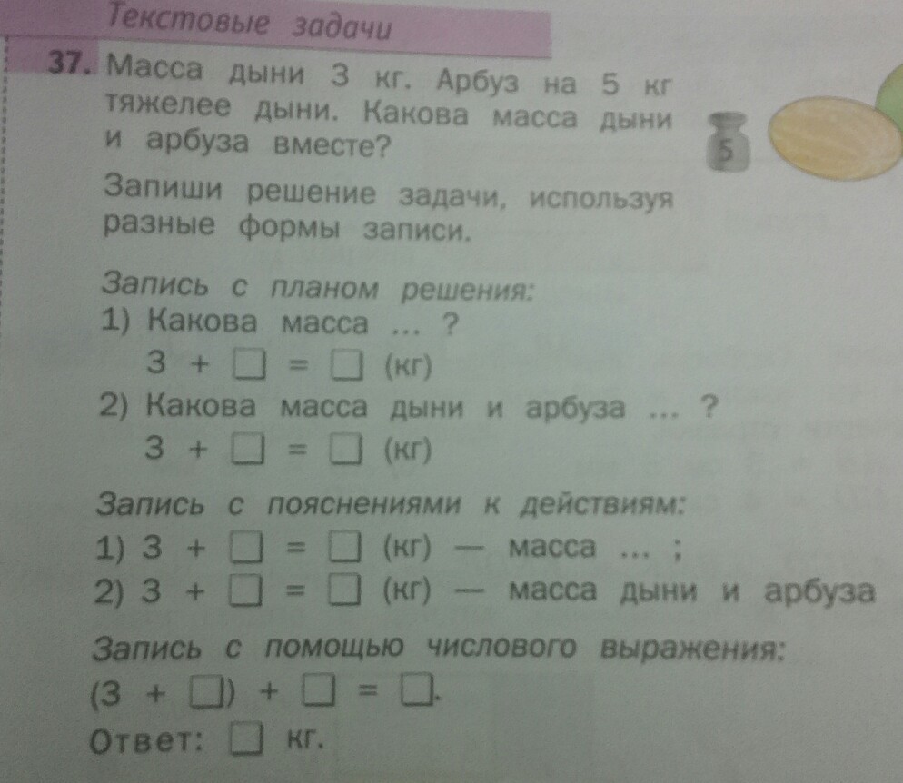 1)3+5=8( кг) масса арбуза
