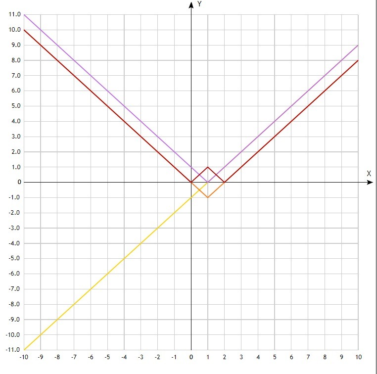 Графики во вложении (жёлтый - y = x - 1; розовый - y = |x - 1|; оранжевый - y = |x - 1| - 1; красный - y = ||x - 1| - 1|).