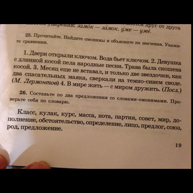 . Когда я вошел в класс, увидел нового учителя. Он мне показал пару приемов, это был высший класс. 2.он показал мне кулак. Собрать дивизию в кулак. 3. У нас в школе проходит ориентационный курс по русскому. Прямо по курсу виднелась земля.4.В магазине мама купила твороженную массу. В задаче нужно найти массу тела.5. Я нажал не на ту ноту, когда играл произведение. Взять высокую ноту.6. В магазин пришла новая партия товара. Спорящие разделились на партии. 7.Я попросила у мамы дать мне совет. Состоялся совет народных депутатов. 8.Он видел весь мир. Как хорошо, когда мир на Земле. 9.На русском языке меня попросили выделить дополнение. Меня попросили сделать дополнение к сказаному.10.Это было непредвиденное обстоятельство. выделить обстоятельство в тетраде.11.Дать точное определение. определение как часть речи. 12.У нее красивое лицо. Это было лицо компании. 13.Нужно обязательно выделить предлог. Под каким предлогом позвать ее в парк. 14.В преложении много союзов. Брак- это союз двух лиц. 15.В некотром роде это гостиница. Продолжить свой род.16.Написать несколько предложения. Это предложения устроится на новую работу