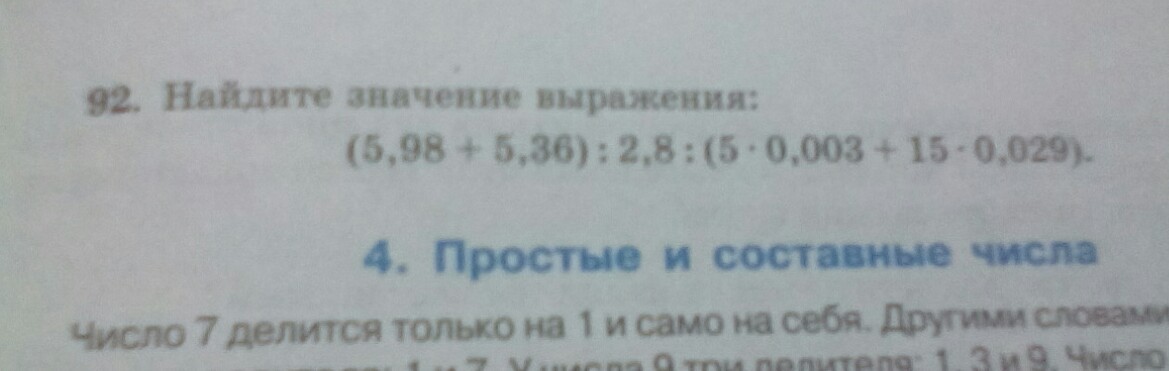 (5,98 + 5,36) : 2,8 : ( 5 * 0,003 + 15 * 0,029)= 9 1) 5,98 + 5,36= 11,34 2) 5* 0,003 = 0,015 3) 15* 0,029= 0,435 4) 0,015+0,435= 0,45 5)11,34:2,8= 4,05 6)4,05:0,45= 9