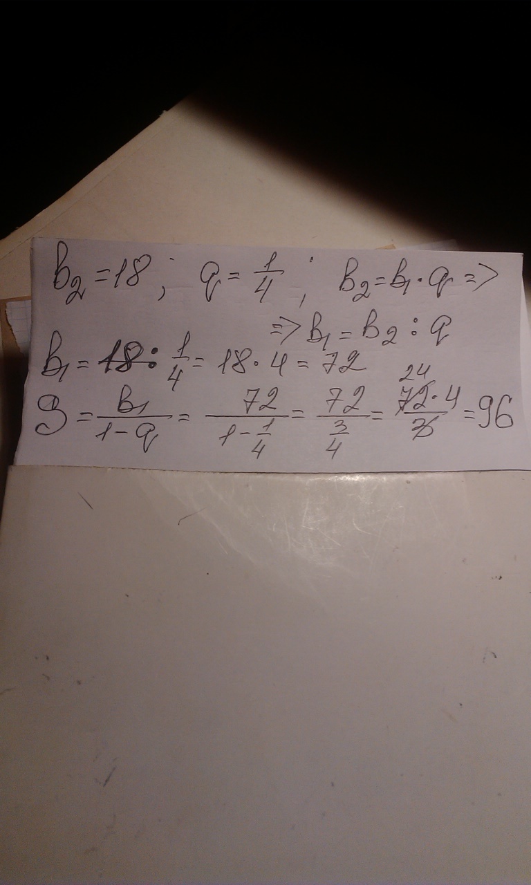 Обчисліть суму нескінченної геометричної прогресії другий член якої в2=18 а знаменник q = дріб 1 4
