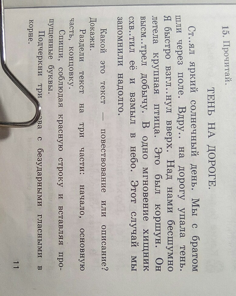 1.часть начало. Стоял яркий солнечный день. Мы с братом шли через поле. 2. часть основная. Вдруг на дорогу упала тень. Я быстро взглянул вверх. Нам нами бесшумно летела крупная птица.Это был коршун. Он высмотрел добычу. 3. часть конец. В одно мгновение хищник схватил её и взмыл в небо. Этот случай мы запомнили на долго. Это описание потомучто в этом тексте описывалось о коршуне и как он взмыл добычу в небо. а 3 вопрос не могу!!!!
