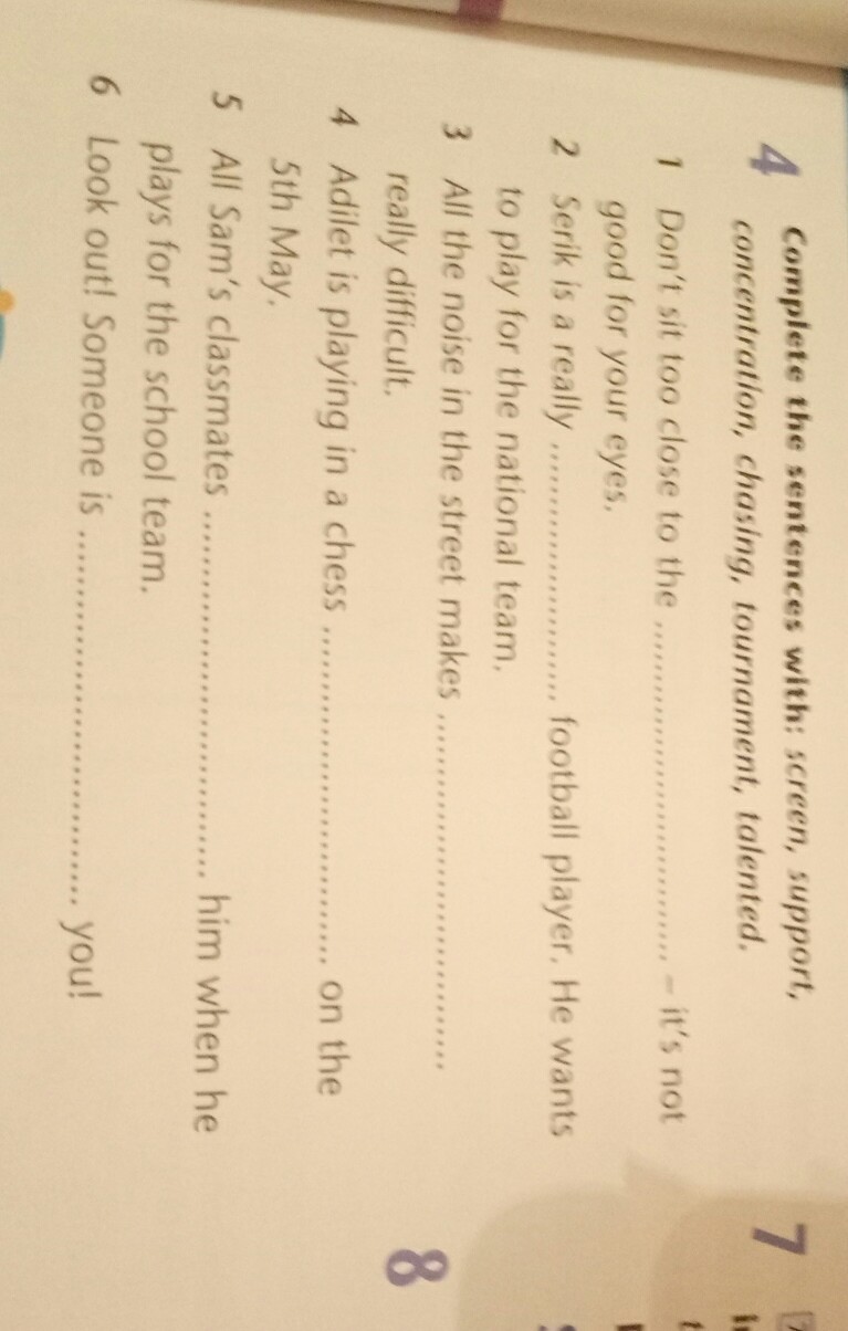 1.screen.2.talanted.3.chasing.4.tournamed.5.support.6.concentration