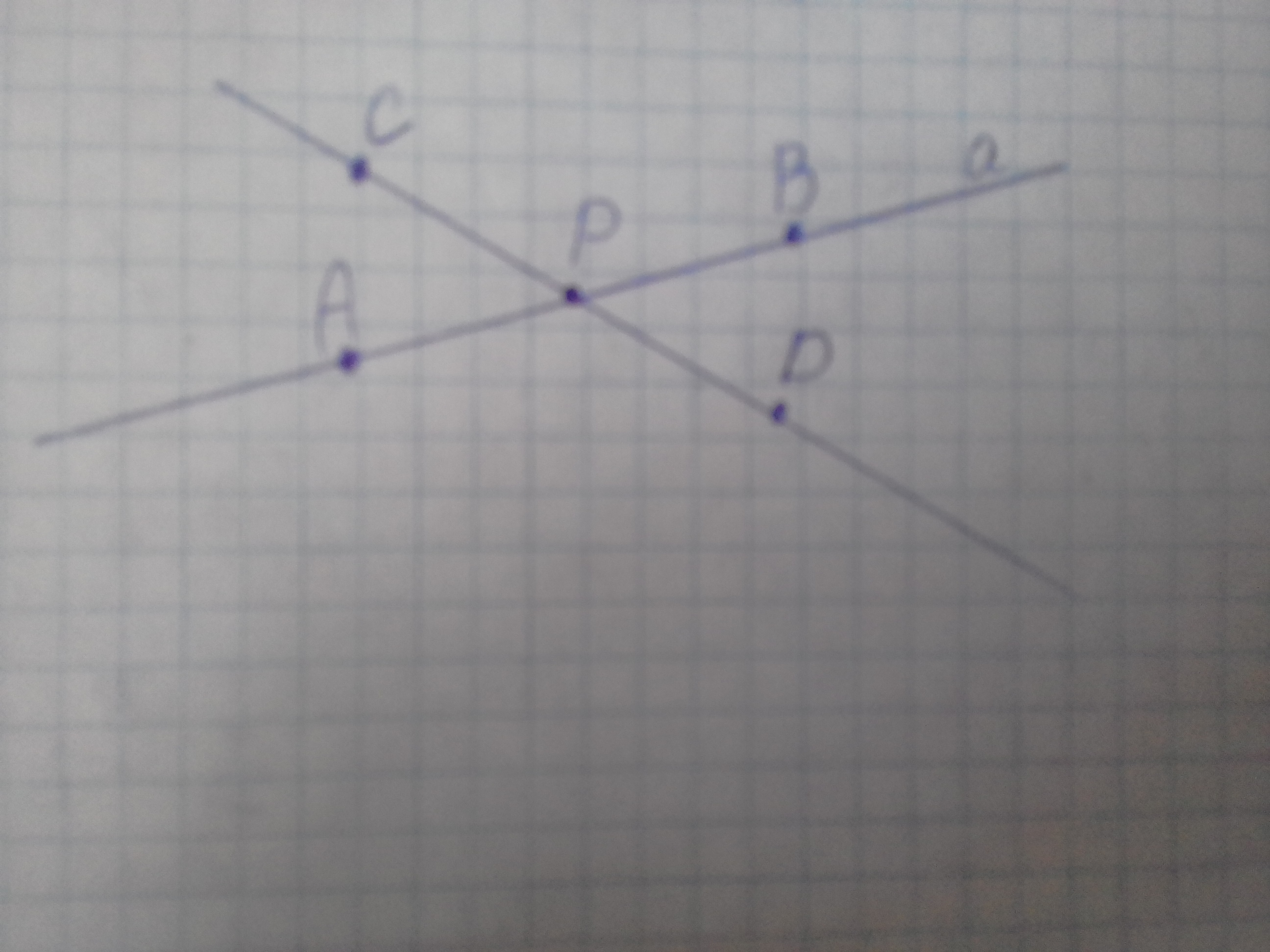 на прямой а отметьте точки А и В. Вне прямой а по разные стороны от нее отметьте точки С и Дтакие,что бы ни точка А ни точка В не принадлежит прямой СД.Найди точку пересечения прямой СД и прямой а.Обозначте её буквой Р.Сколько всего прямых задают пары отмеченных точек.