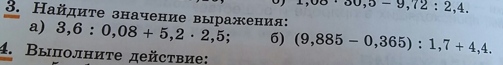 а) 3,6 ÷ 0,08 + 5,2 × 2,5