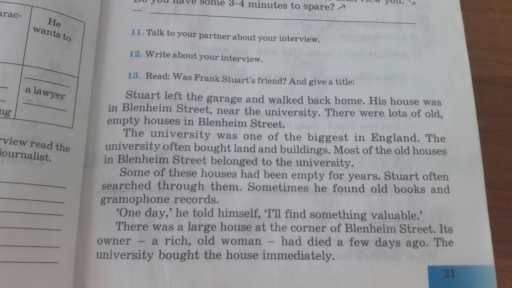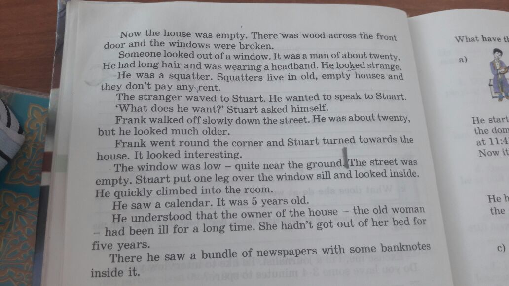 Стюарт вышел из гаража и направился обратно домой. Его дом был на улице Бленхейм, рядом с университетом. На улице Бленхейм было много старых, бесхозных домов. Университет был одним из крупнейших в Англии и часто скупал землю и здания. Большинство старых домов на улице Бленхейм принадлежало университету. Некоторые из этих домов пустовали уже многие годы. Стюарт часто их обыскивал. Иногда он находил старые книги и грамофонные пластинки. "Когда-нибудь," - говорил он себе, "я найду что-нибудь ценное" На углу улицы Бленхейм стоял большой дом. Его хозяйка - богатая пожилая женщина - умерла несколько дней назад. Университет незамедлительно выкупил дом. Сейчас дом пустовал. Дверь была заколочена досками, а окна разбиты.Кто-то выглянул из окна. Это был мужчина примерно двадцати лет с длинными волосами и ободком на голове. Это был сквоттер. Сквоттеры живут в старый, бесхозных домах и не платят за съём. Незнакомец помахал Стюарту. Он хотел поговорить со Стюартом. "Что ему нужно?" - подумал Стюарт. Френк медленно шёл по улице. Ему было около двадцати, но он выглядел намного старше. Френк зашёл за угол и Стюарт повернулся к дому. Он выглядел необычно. Окно распологалось очень низко, почти у самой земли. На улице никого не было. Стюарт перекинул ногу через подоконник и заглянул внутрь. Он быстро забрался в комнату. Он увидель календарь пятилетней давности и понял что пожилая хозяйка дома давно болела. Она не вставала с постели пять лет. Тут же он нашёл пачку газет с деньгами внутри.