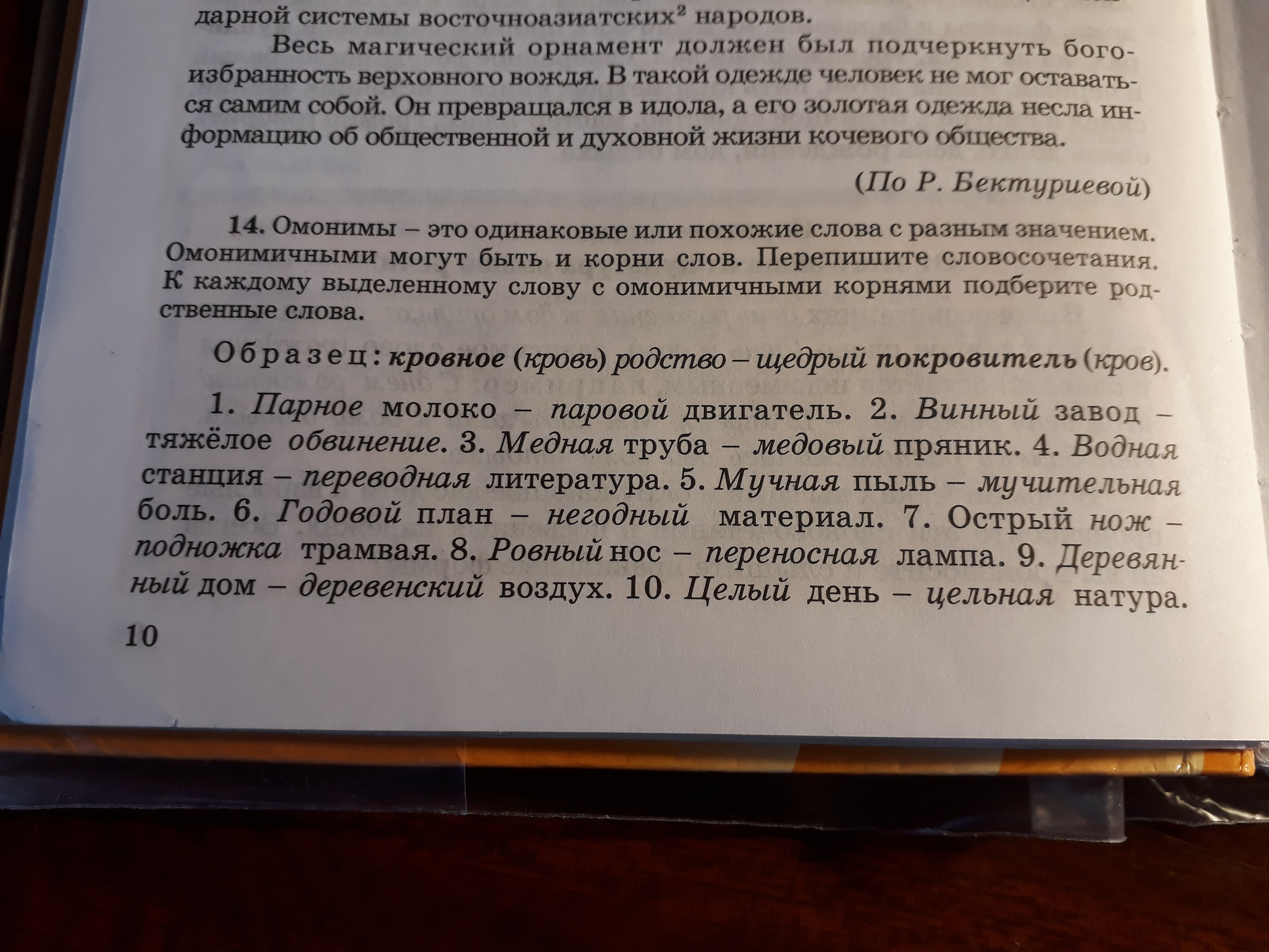 Парное ( пар или парить) молоко, паровой ( пар) двигатель. Винный (вино) завод, тяжёлое обвинение ( вина). Медная (медь) труба, медовый (мёд) пряник. Водная (вода) станция, переводная (перевод) литература. Мучная (мукá) пыль, мучительная (мука) боль. Годовой ( год) план, негодный (годится ) материал. Острый нож ( корень слова), подножка (ножка) трамвая. Ровный (прямой ?) нос, переносная ( носить, нести) лампа. Деревянный ( дерево) дом, деревенский ( деревня) воздух. Целый ( полный, тут показывается период времени, его длительность) день, цельная ( единая, то есть одно целое, тут описываться личность, её качества) натура