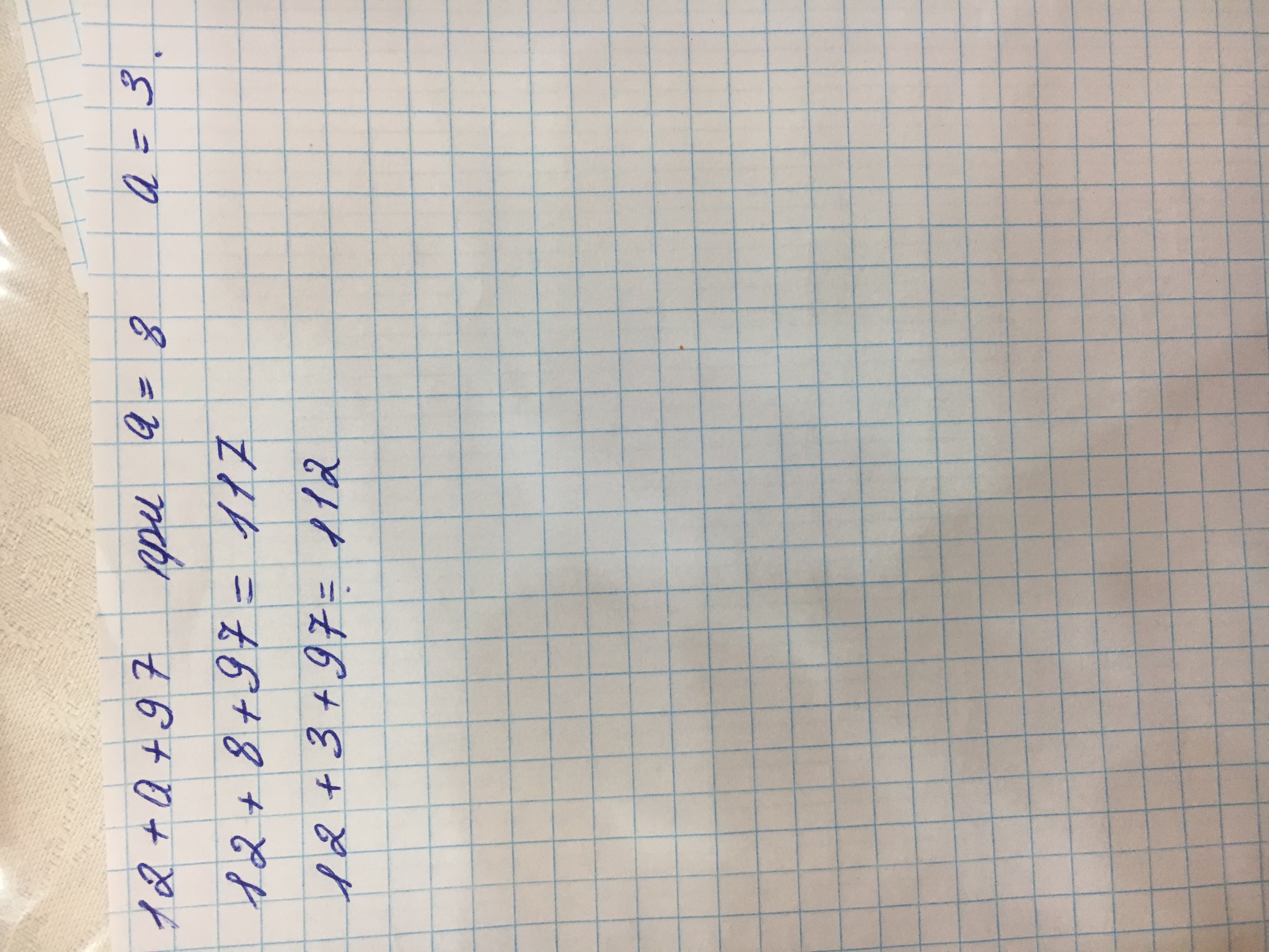 Помогите! я 5-ти классник вот пример кто ответит тому ОГРОМНОЕ СПАСИБО!!!! Пример(Значение буквенного выражения, используя дейвствия): 12+а+97 при а=8; 3; пж