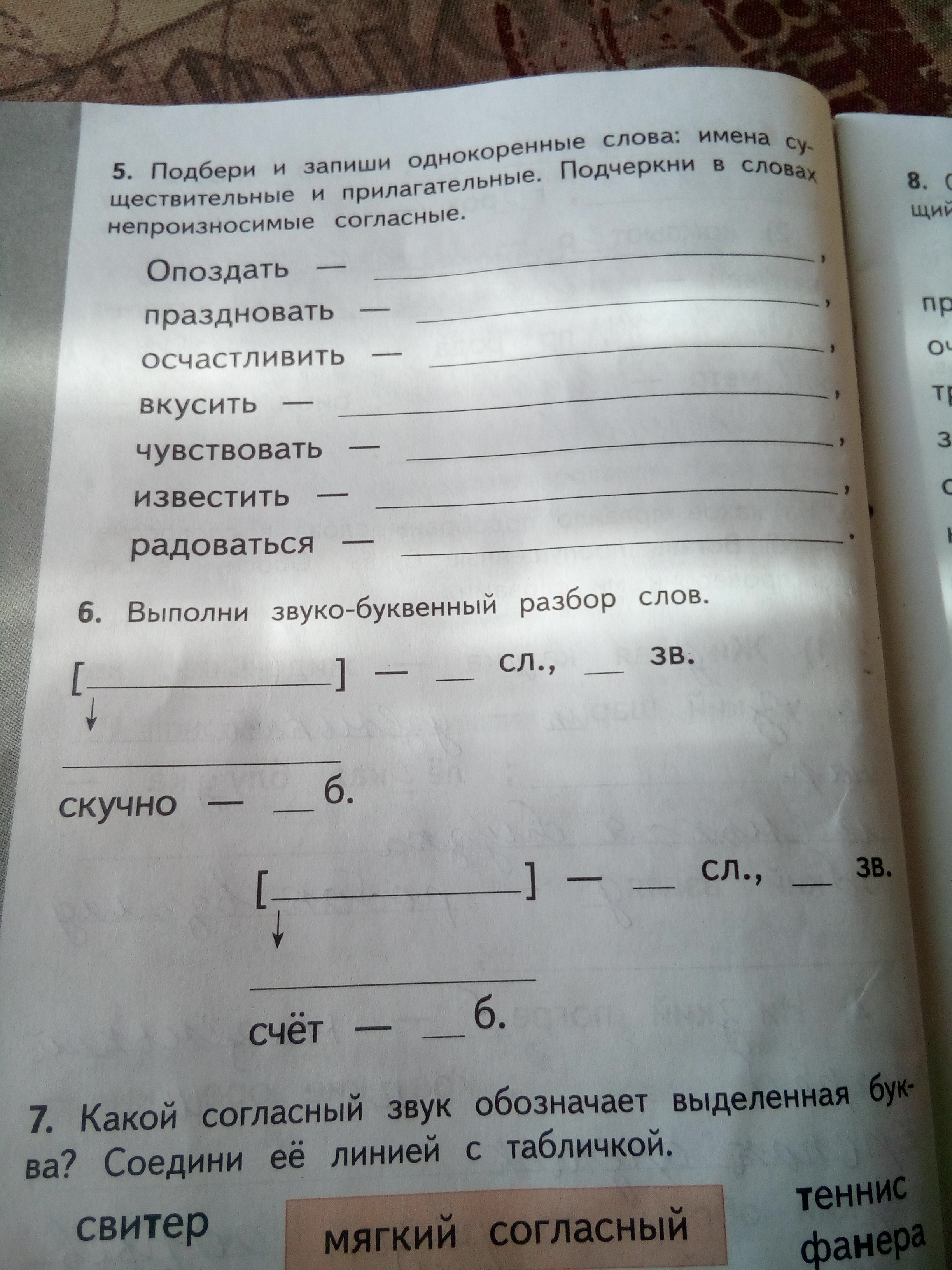 1)скучно [скушна]-6 букв, 6 звуков, 2слога