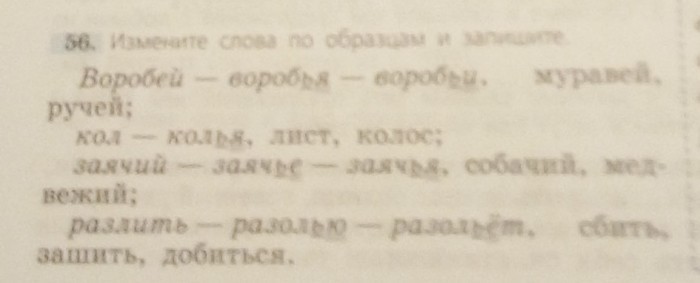 Муравей — муровья — муравьи, ручей — ручья — ручьи.