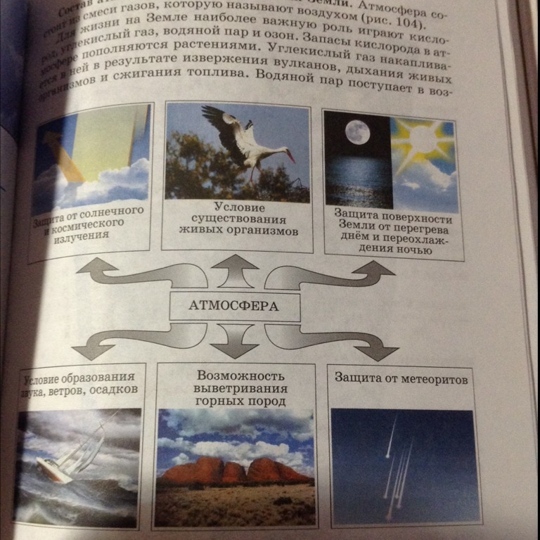 атмосфера является важной частью условия существования живых организмов. также атмосфера защищает людей от ультрафиолетовых лучей и перегревания.