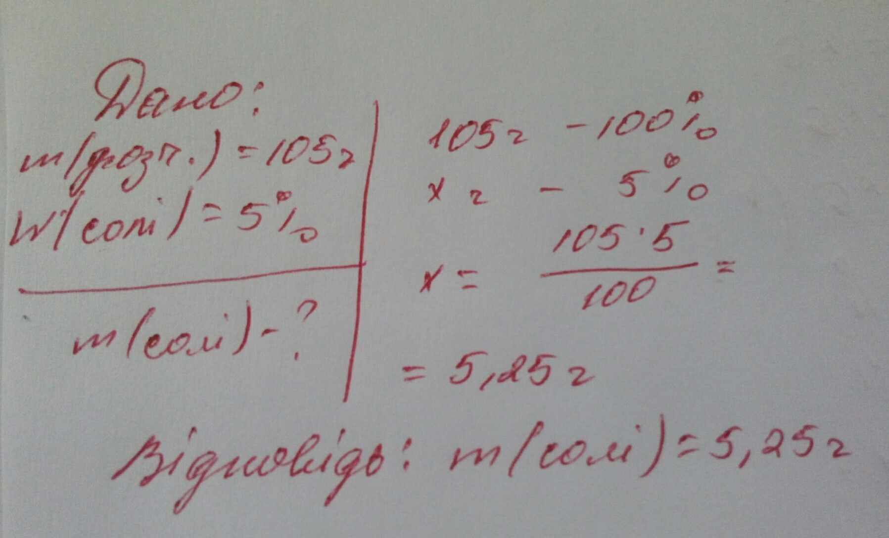 Обчисліть масу солі, що лишиться після випаровування води з розчину масою 105 г, у якому масова частка солі становить 5%