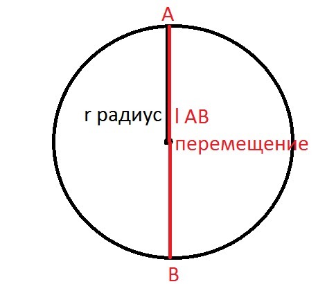 Точка А движется с постоянной скоростью по окружности радиус которой 2 м. Найти модуль перемещения этой точки за время в течении которого она пройдет половину длины окружности.