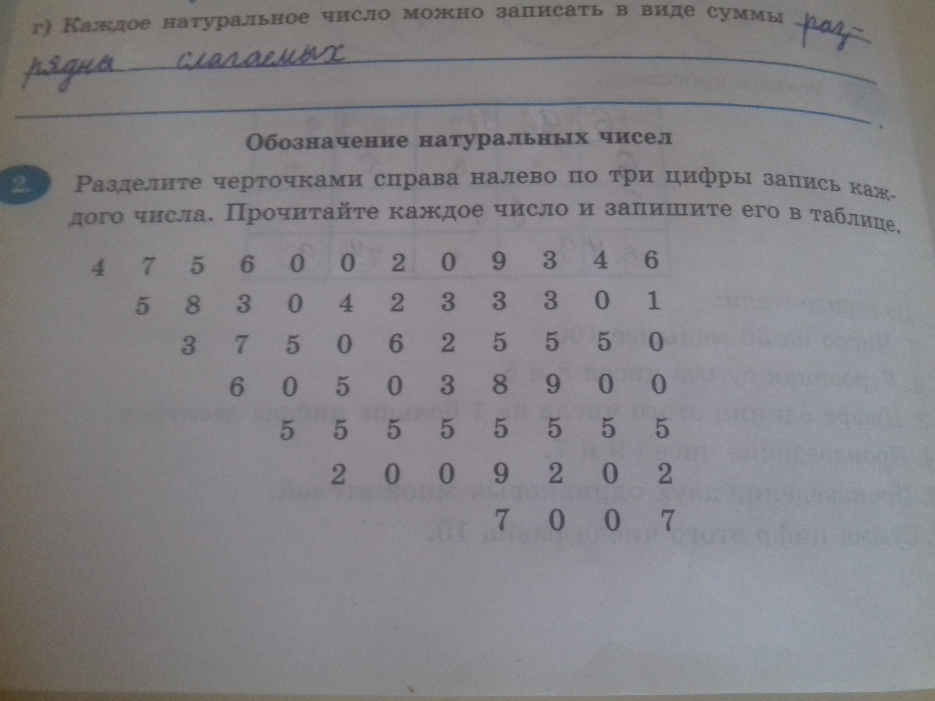 Раздели чёрточками справа налево по три цифры записи каждого числа. Прочитайте каждое число и запишите его в таблице.