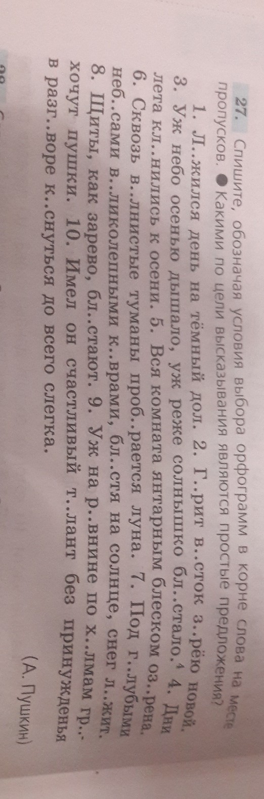 Простые предложения - это предложения с одной основой. Чтобы найти простые предложения, нужно выделить грамматическую основу во всех предложениях. Где грамм. основа будет одна - там, следовательно, и кроется наше простое предложение. После того, как ты нашёл это предложение - в скобочках, в конце. напиши, какое оно по цели высказывания, (как определить, написала выше).