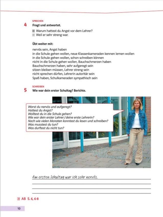 Ich habe Angst. Ich will in die Schule nicht gehen. Meine Lehrerin war schön und gut. Ich konnte nach 2 Monaten lesen und schreiben.Ich muss lesen, schreiben, rechnen und meine Hausaufgauben machen.Ich darf nicht malen und singen.
