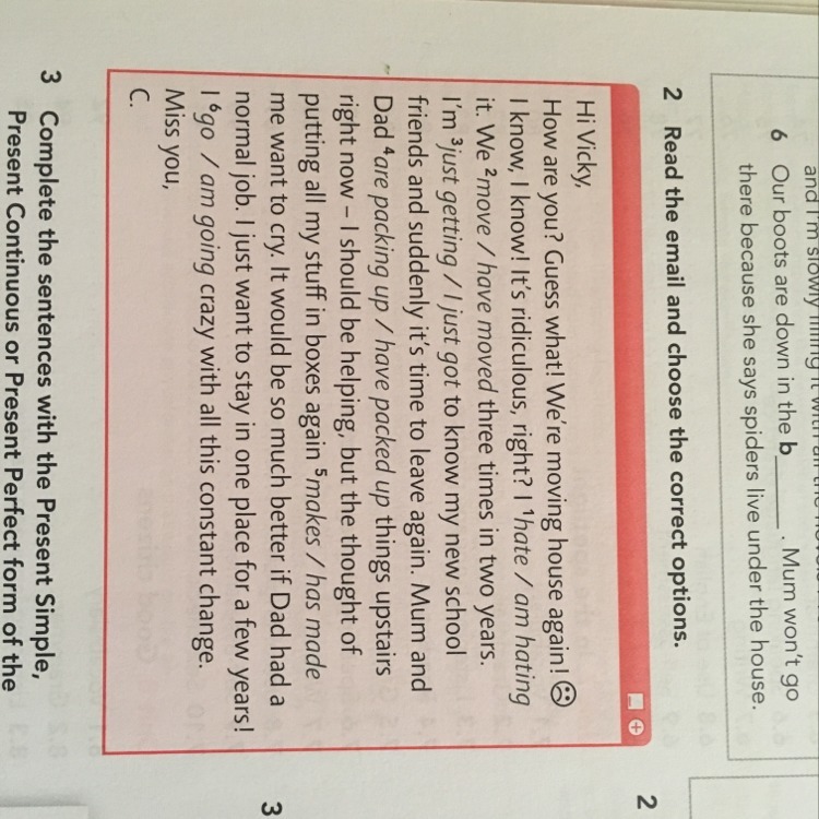 1. hate 2. have moved 3. just getting 4. are packing 5. makes 6. i am going