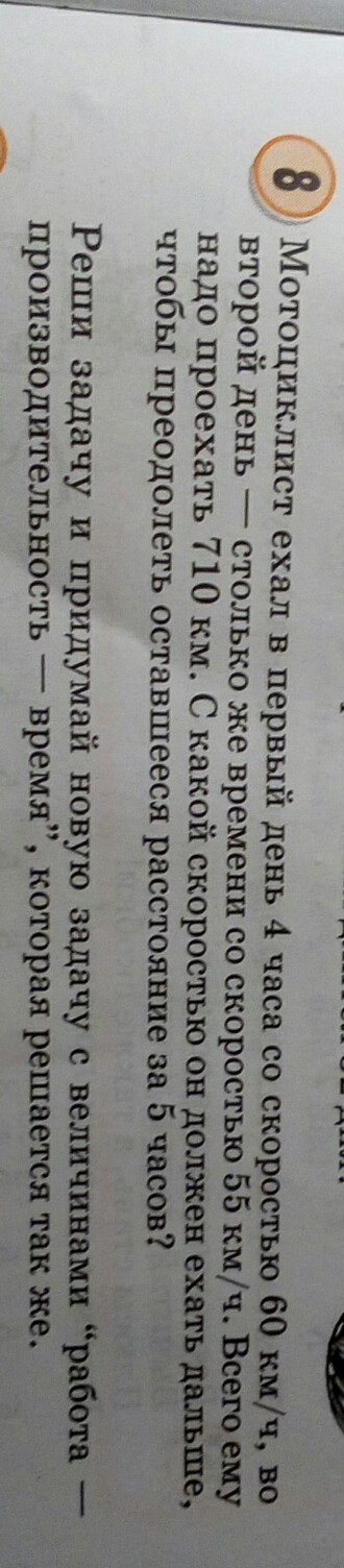 В первый день рабочий работал 4 часа и изготавливал 60 деталий в час.Во второй день он работал столько же,но изготавливал 55 деталий в час.Всего ему надо изготовить 710 деталей.С какой производительностью он должен работать дальше,чтобы закончить изготовление деталей за 5 часов.