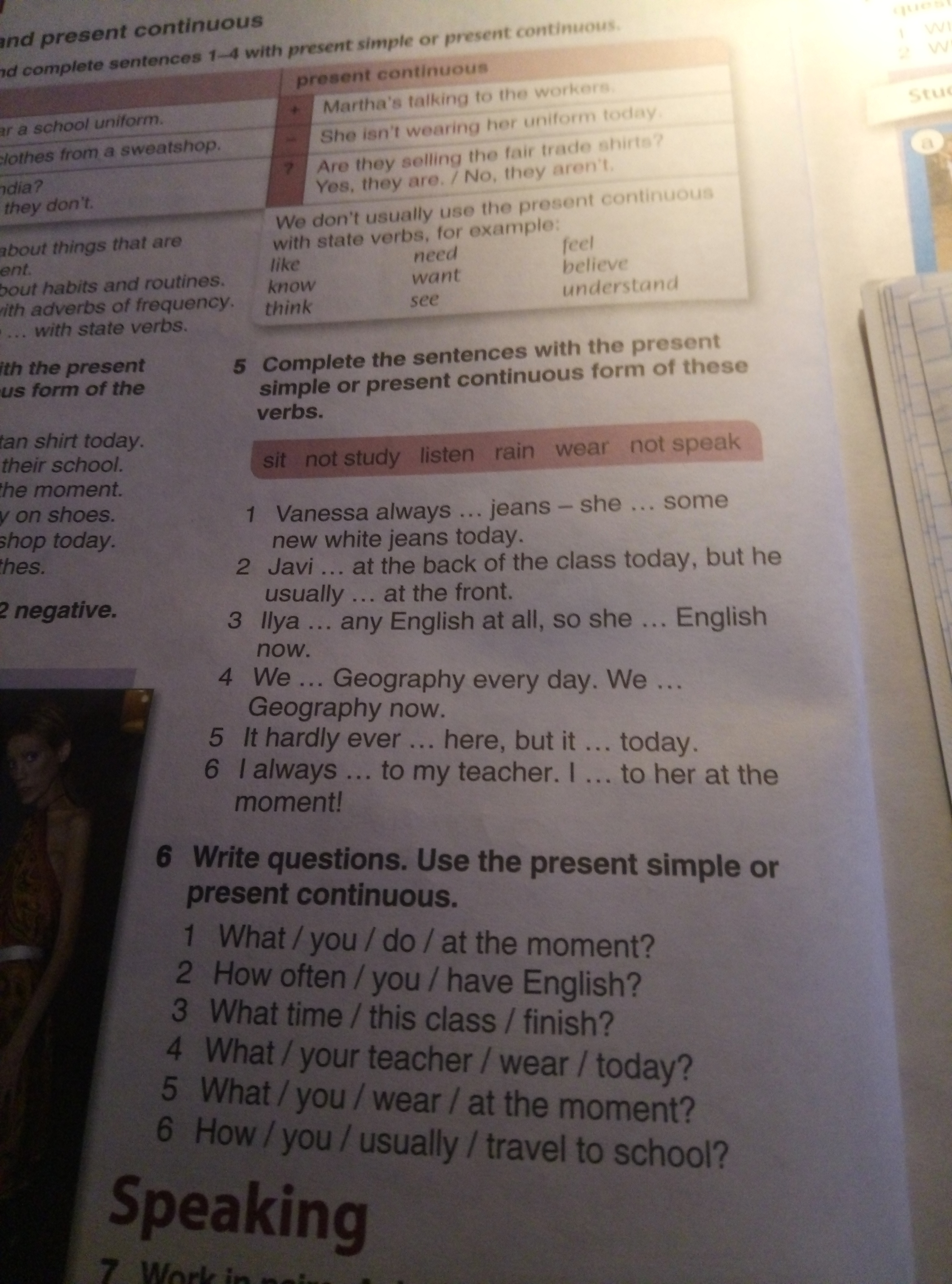 Привет, я тебя хочу предупредить, что это очень важная тема (present simple и present continious). Лучше разобраться сейчас (подойти к учителю, нанять репититора). Потому что это основа английского языка, и без знания этой основы у тебя ничего в будующих классах не получится. Тем более, сейчас язык самый популярный в мире и без знания английского не берут на многие работы. Извини, что лезу не в свое дело, но я обязан был это посоветовать. Удачи в школе и в изучении английского :)