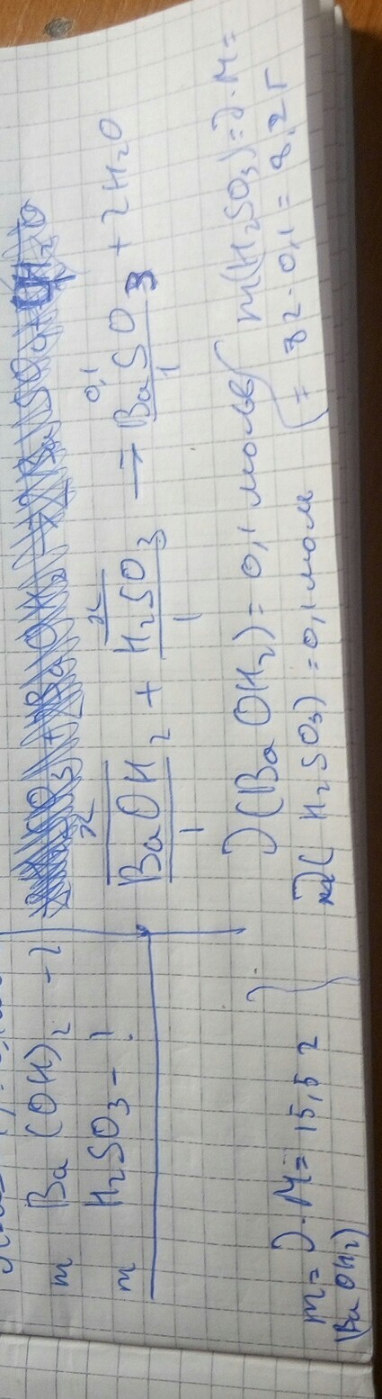Вычислите МАССЫ серной кислоты H2SO3 и бария гидроксидаBa(OH)2 которые следует использовать чтобы добыть Барий сульфат BaSO4 количество вещества 0.1 моль.