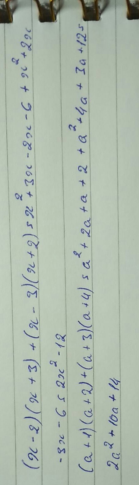 Упростите выражение (х-2)(х+3)+(х-3)(х+2)и теперь 2 задание тоже упростить (а+1)(а+2)+(а+3)(а+4) помогите прошу