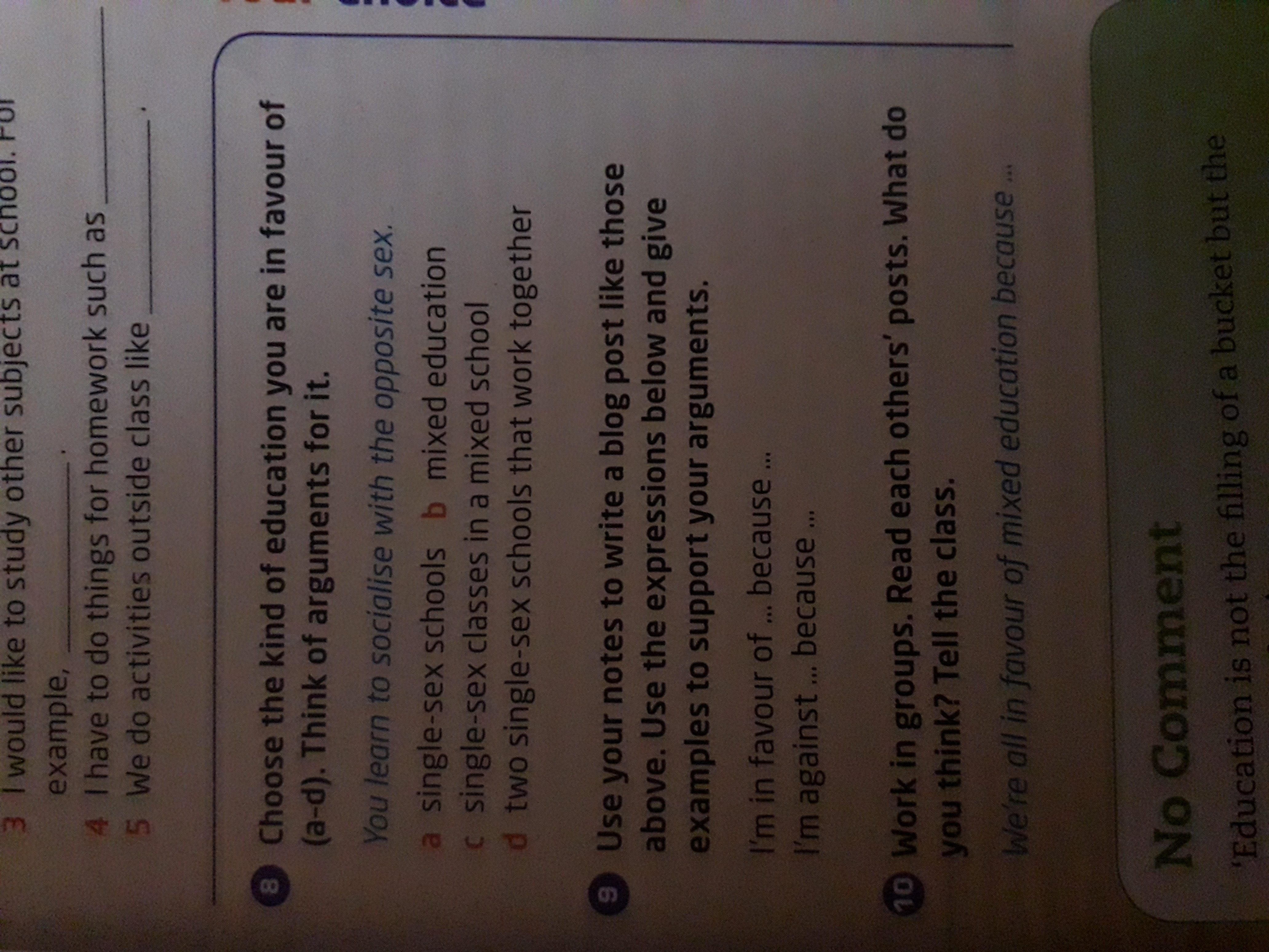 2) I'm against single-sex school because boys and girls should study together. I don't kniw, why people want to do single-sex school. We are the humans, so we should study together.