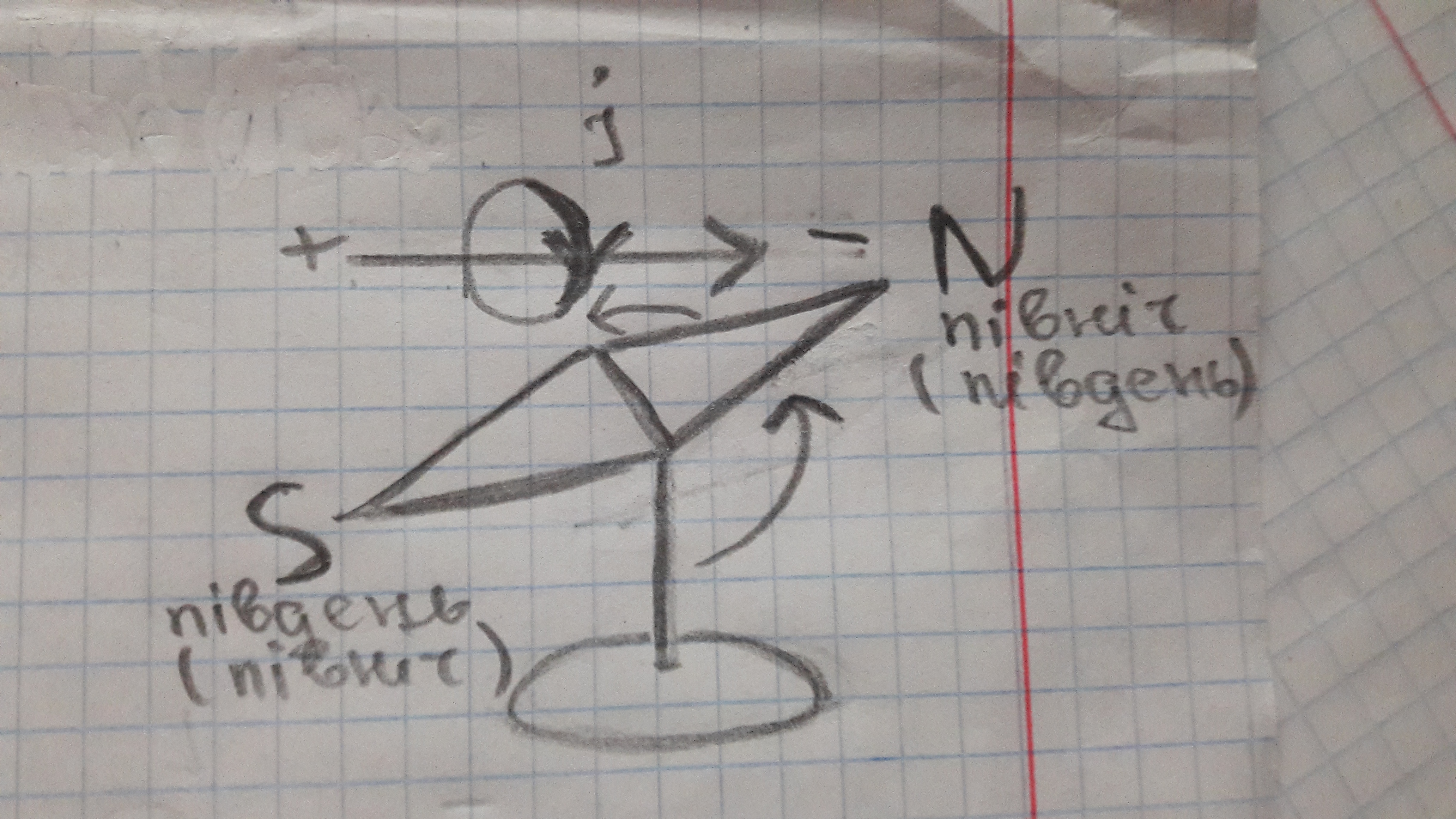 Яким полюсом має повернутися до нас магнітна стрілка?Чи змінеться відповідь,якщо стрілку розташувати над провідником?