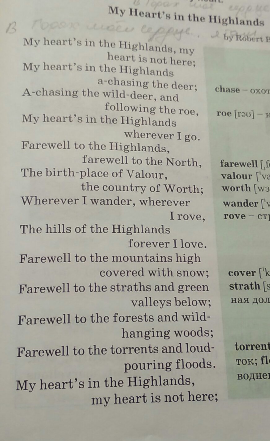 l's in the in the My heart's in the Highlands, мое сердце не здесь; Мое сердце в горах, преследующее оленя, преследующего дикого оленя, и, следуя за иконой, Мое сердце в горах, куда бы я ни пошел. Прощание с Нагорье, прощание с Севером. Место рождения Доблести, страна Уорта, куда я блуждаю, где бы я ни росла. Холмы Высокогорья навсегда я люблю. Прощание с высокими горами, покрытыми снегом. Прощание с платами и зелеными долинами ниже. Прощай с лесами и лесными деревьями; Прощание с потоками и проливные наводнения. Мое сердце в горах, здесь;