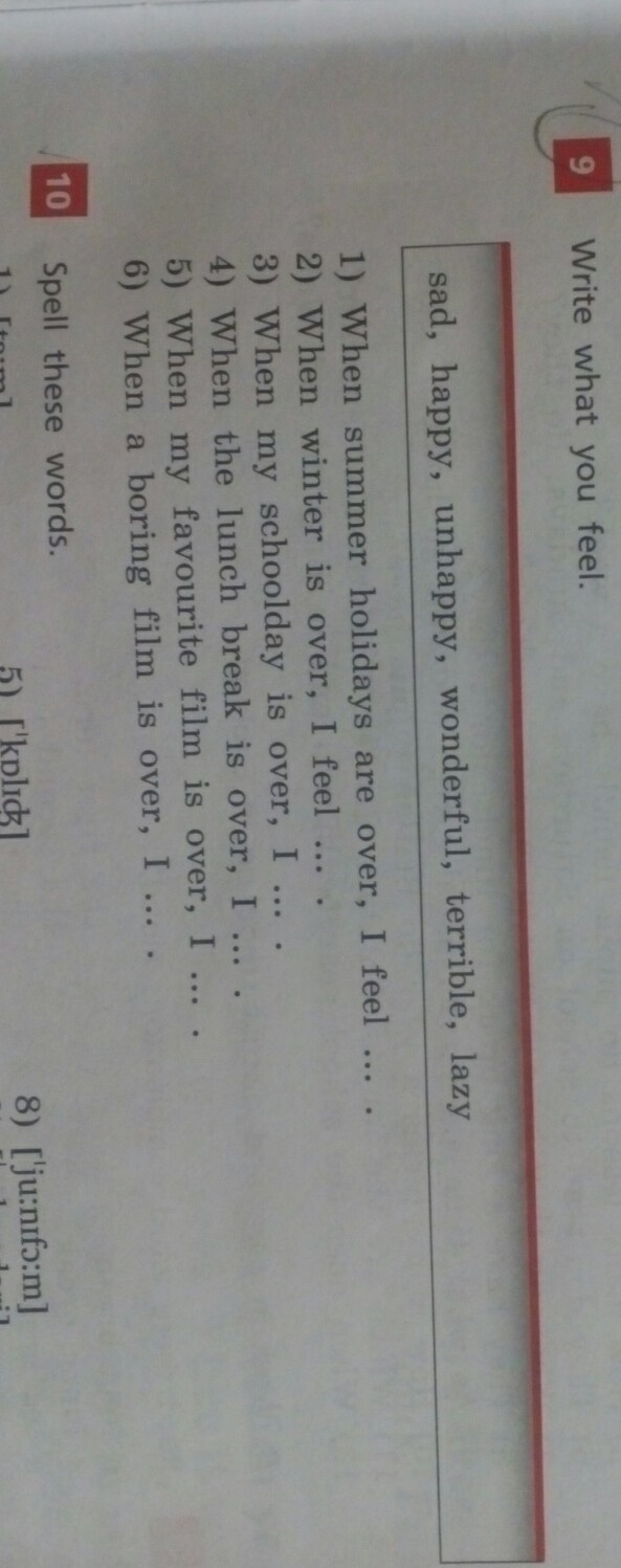 1) sad 2) unhappy 3) happy 4) lazy 5) wonderful 6) terrible