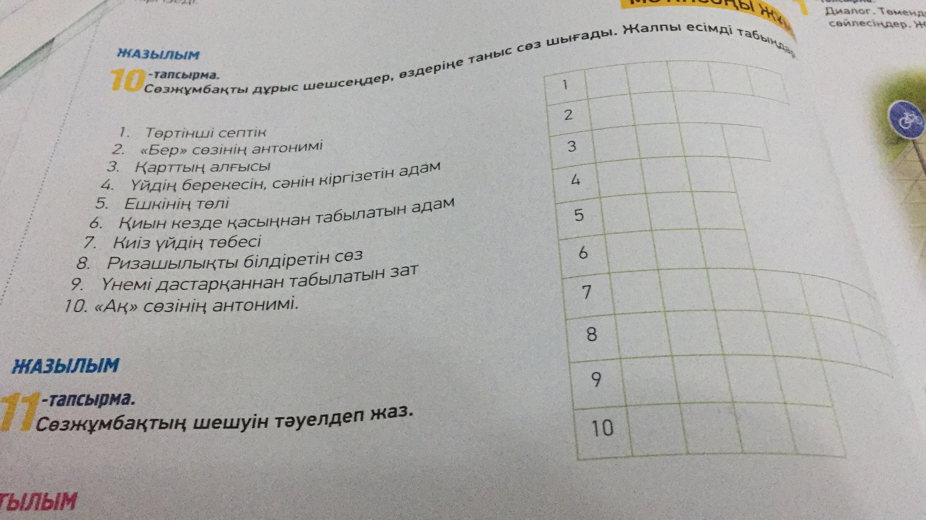 1 табыс,2 ал ,3 риза,4бала 5 лақ,6дос,7шаңырақ,8рахмет,10қара кешір білетіндерімді ғана жаздым