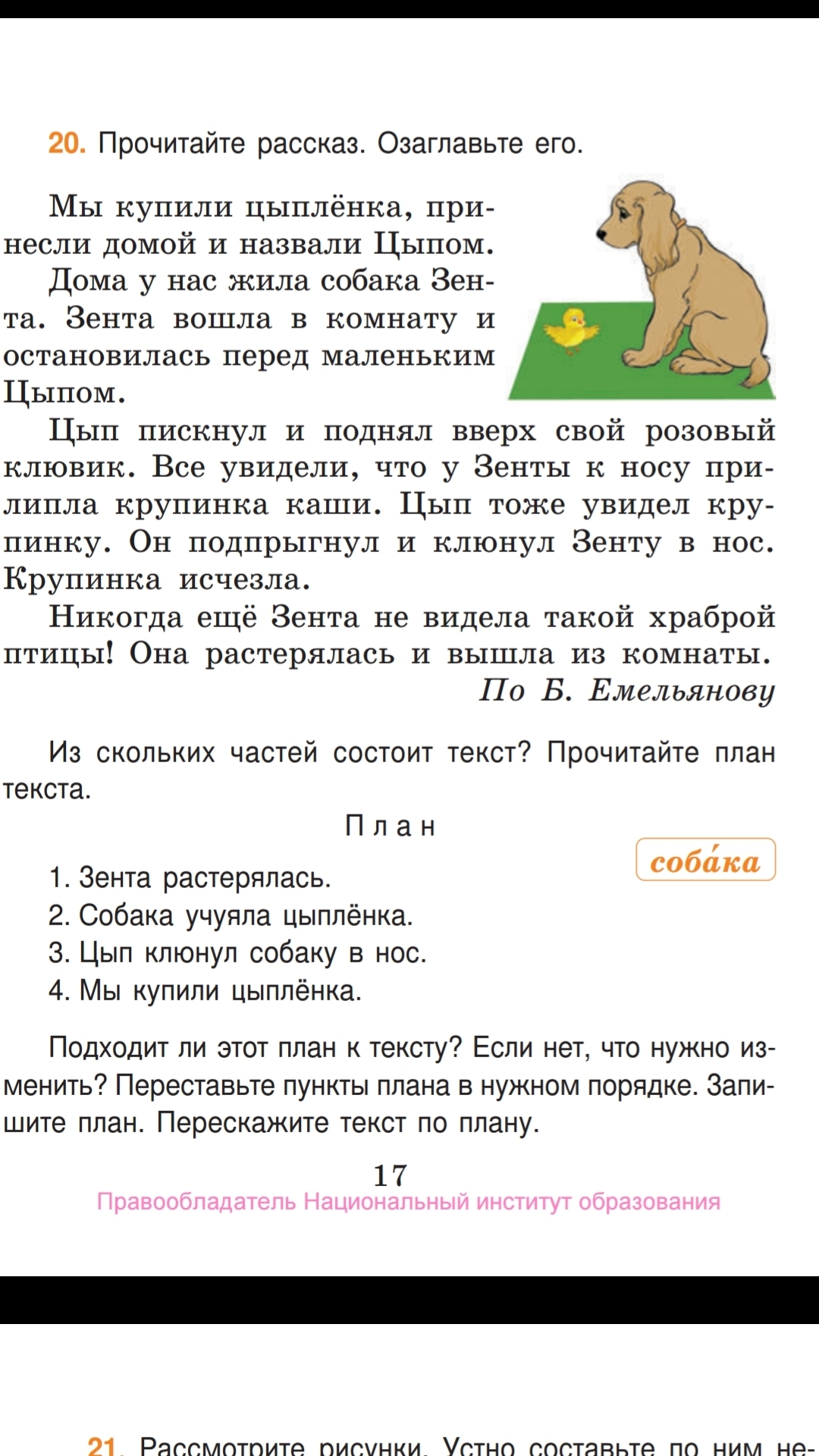 План не подходит, 4-ое не правильное, 1-ое должно быть Мы купили цыплёнка. Так-же текст можно озаглавить как Храбрый Цыпа и Зента.