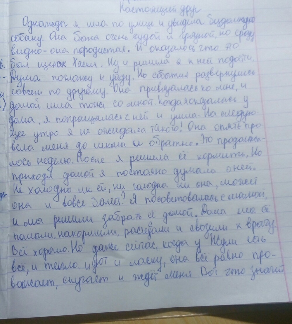 Блуждающую*;И оказалось,что этот щенок был породы "Хаски"*;Я решила к ней подойти*;Думала,что поглажу и уйду,но события развернулись совсем по-другому*;Она привязалась ко мне и домой..*;Когда я оказалась у дома,я,оставив ее саму,ушла*;Но, приходя домой,я постоянно..*;..,может,она и вовсе болеет?*;Домы мы помыли,накормили,расчесали и свозили ее к ветеринару.*;Все хорошо,но..*;