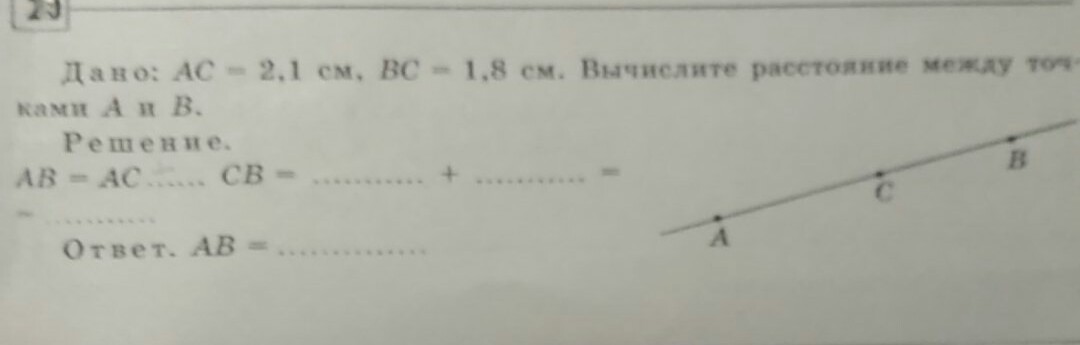 AB = AC + CB= 2,1+1,8 =3,9 см