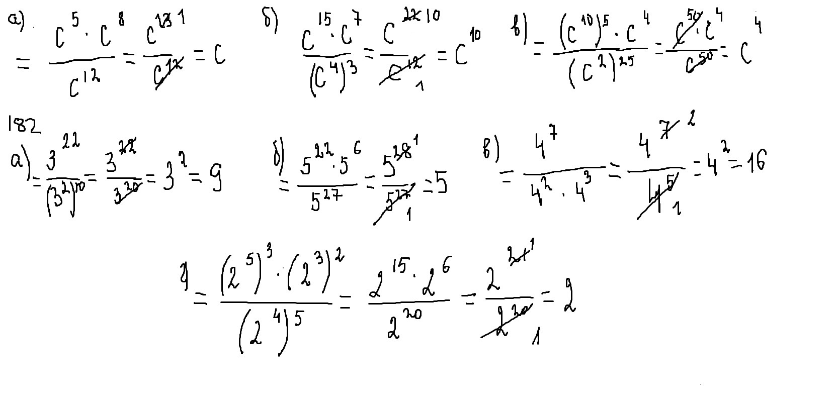 при возведении степени в степень показатели перемножаются,при умножении степеней показатели складываются,при делении степеней показатели вычитаются(конечно же основания степеней должны быть одинаковыми)
