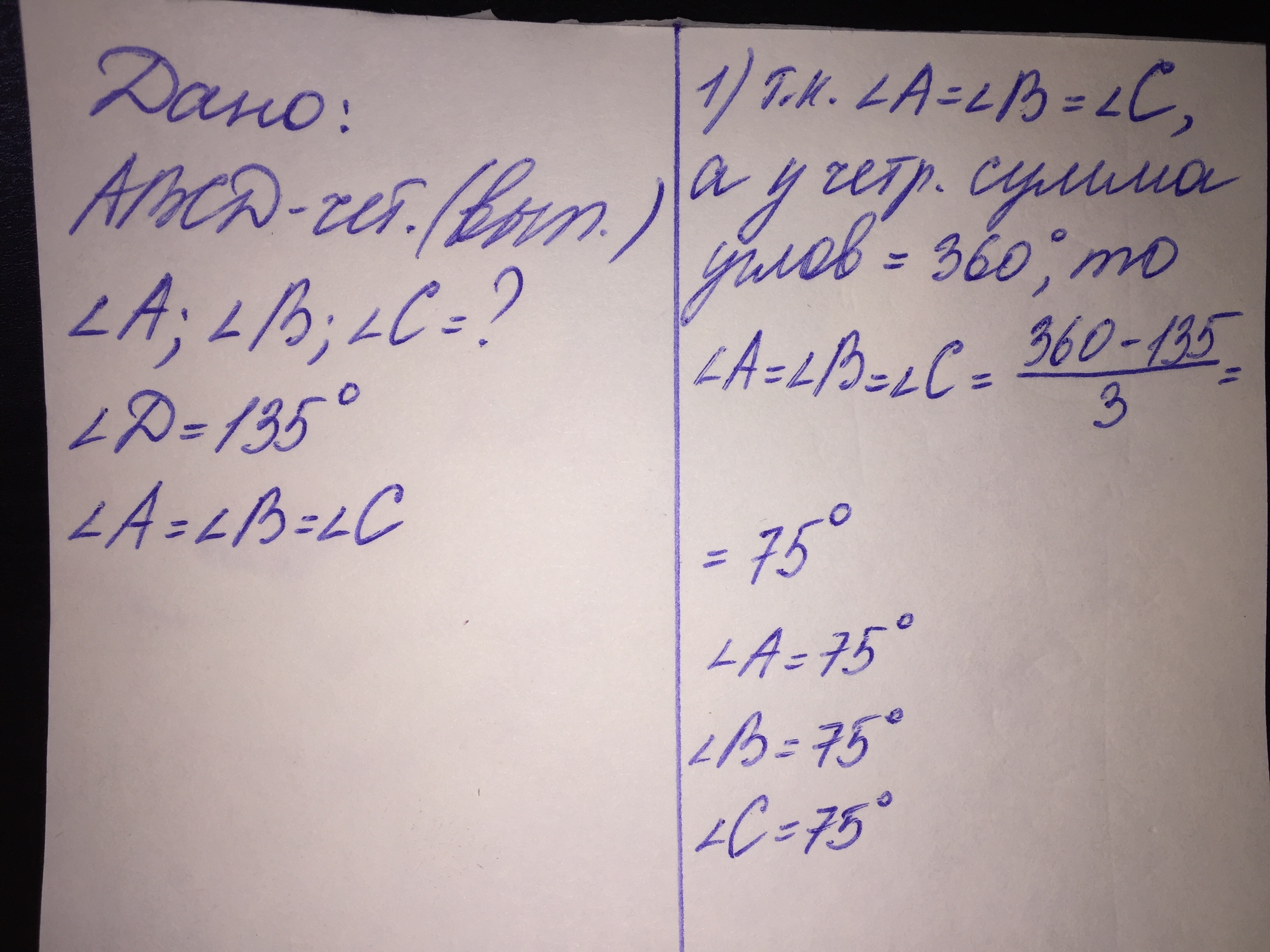 Дан выпуклый четырехугольник ABCD . Найдите углы А , B и C , если уголD =135° и угол А =угол B = угол C