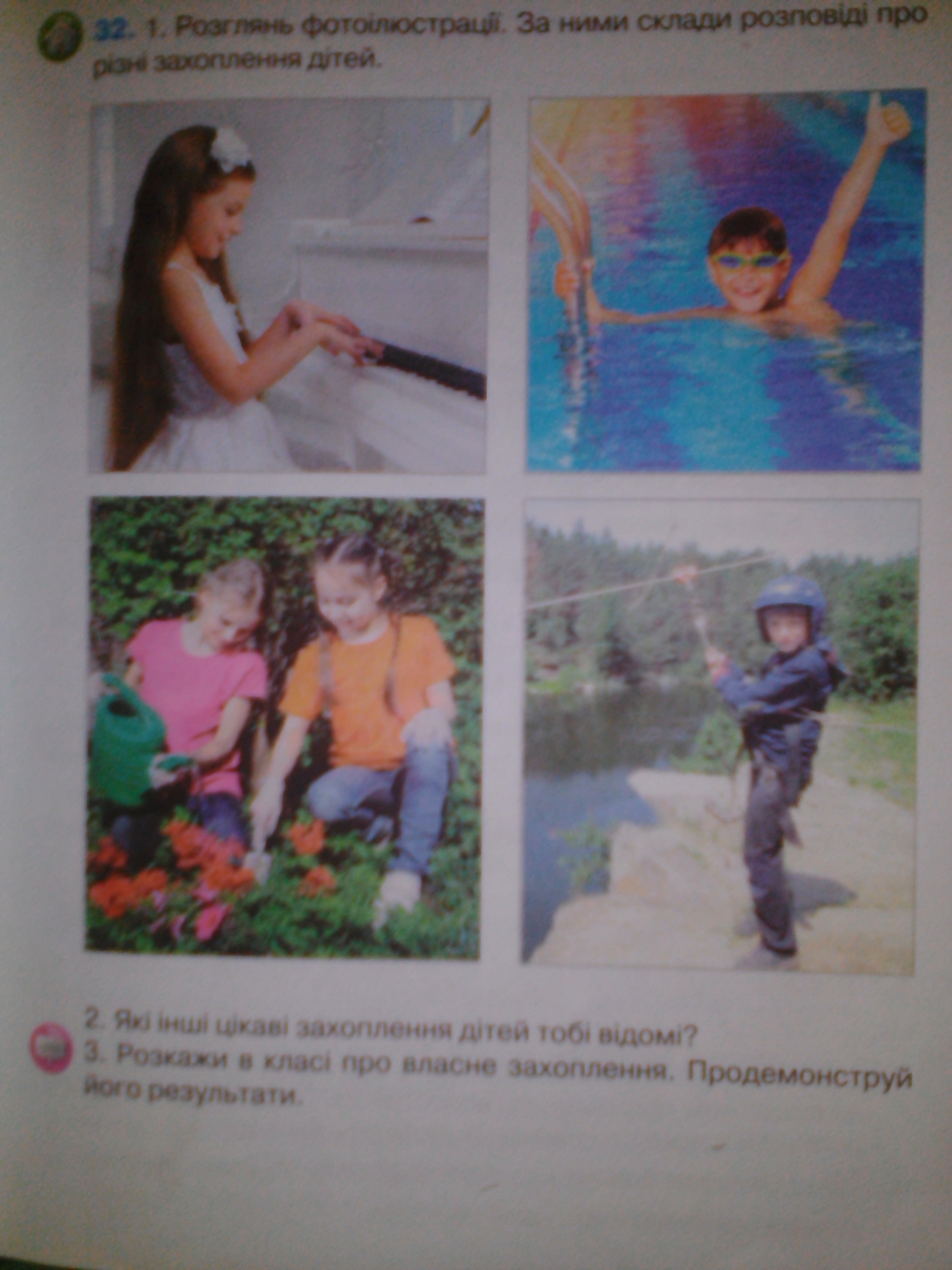 Завдання: Розглянь фотоілюстрації. За ними склади розповіді про різні захоплення дітей. Які інші цікаві захоплення дітей тобі відомі?