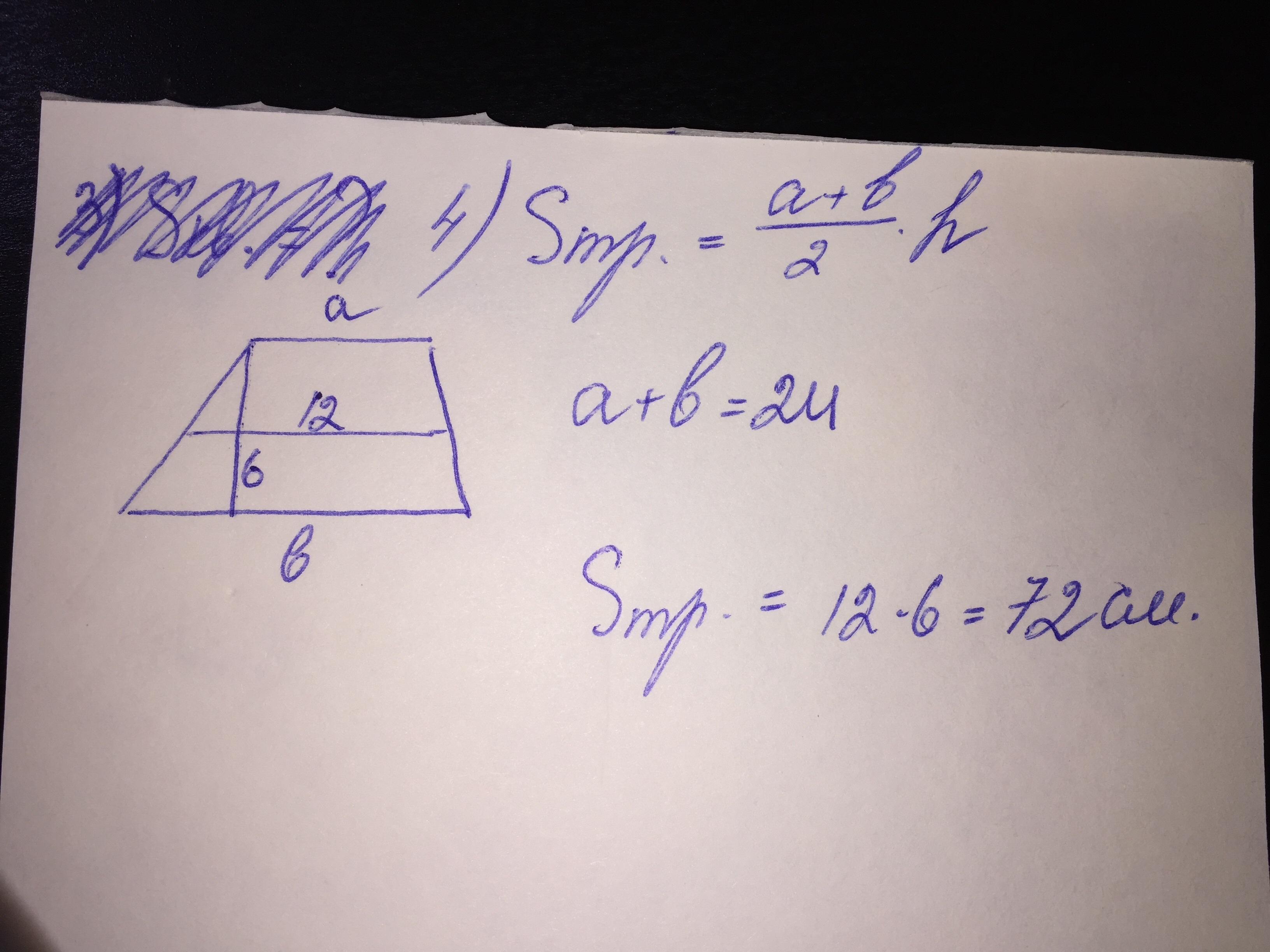 4)Найдите площадь трапеции ,средняя линия которой равна 12см,а высота 6 см