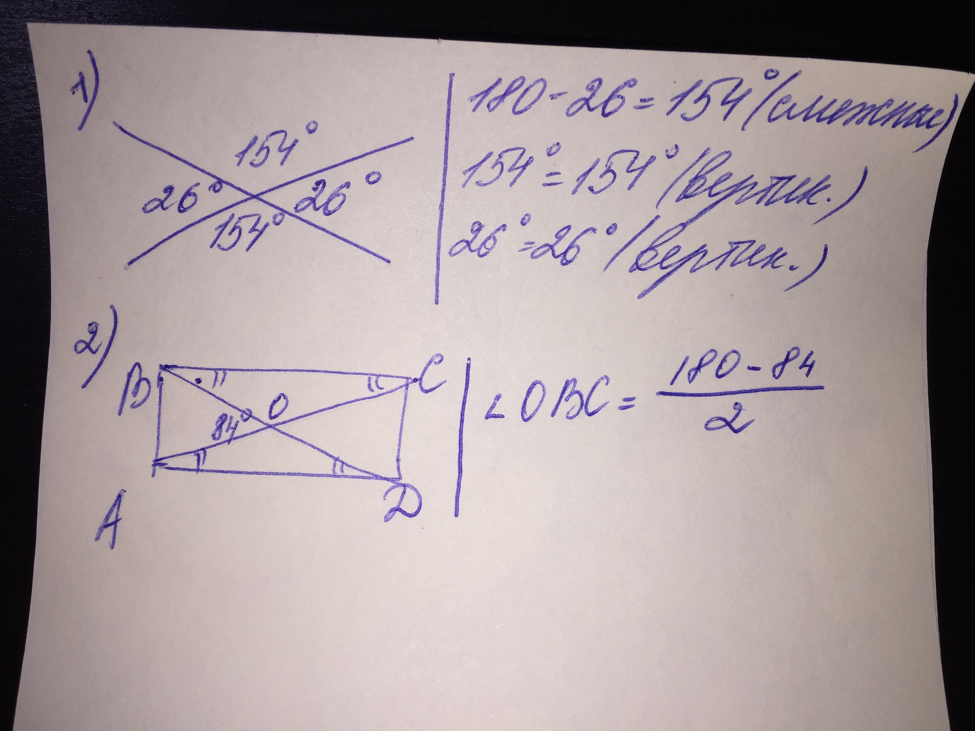 2)в прямоугольном прямоугольнике ABCD диагонали AC ,пересекаясь в точке 0,образуют уголAOB=84°.Найдите величину угла OBC