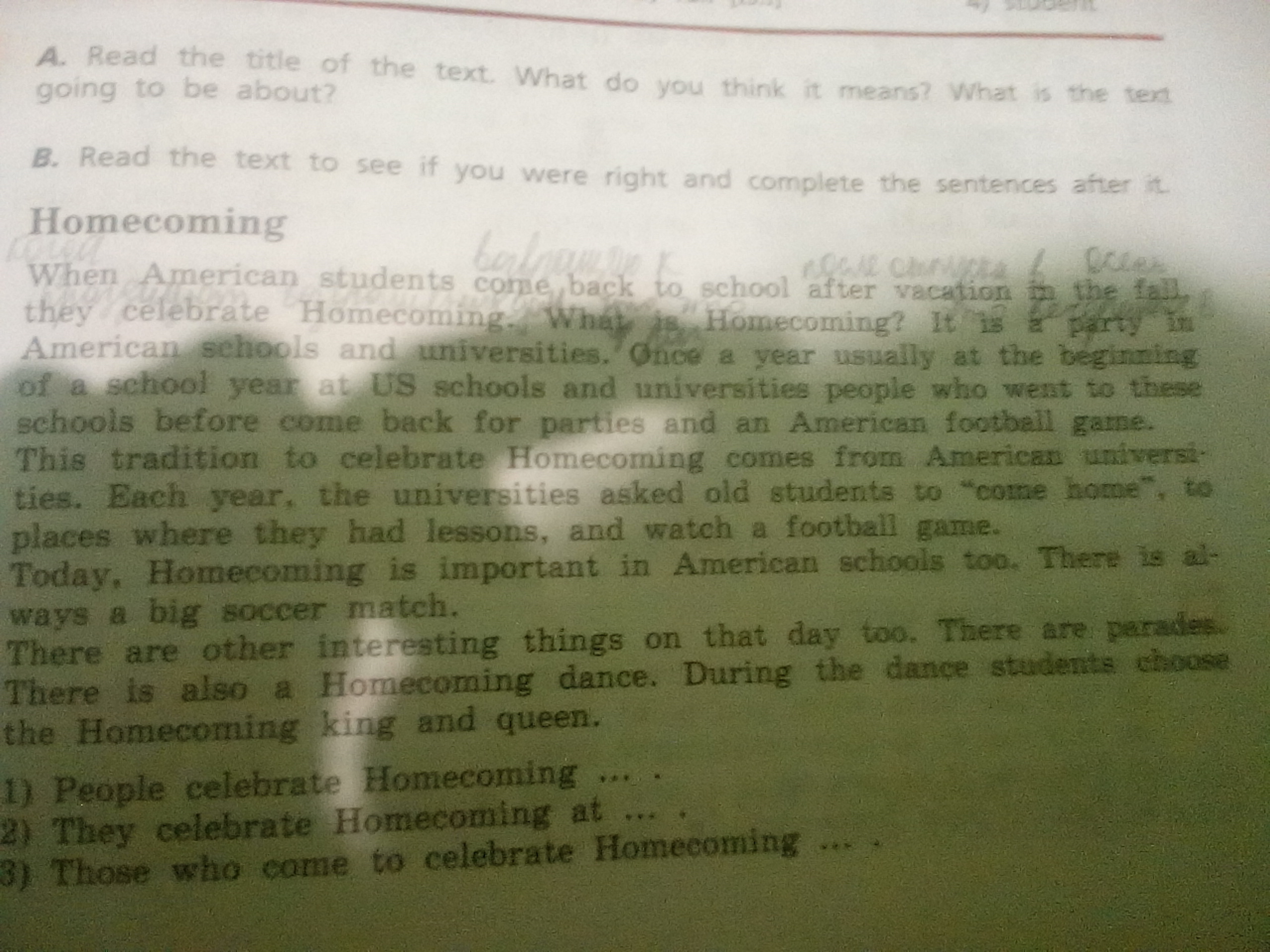 Когда американские студенты осенью возвращаться в школу после отдыха, они отмечают вечер встречи выпускников. Что такое вечер встречи выпускников? Это вечеринка в американских школах и университетах. Раз в год, обычно перед началом учебного года в Американских школах и университетах люди которые раньше посещали это школу приходят для тусовки и Американского футбола. Традиция празднования вечера встречи выпускников пришла от Американских университетов. Каждый год университет просит старых струдентов "прийти домой", в то место где у них были уроки, где  смотрели футбол.