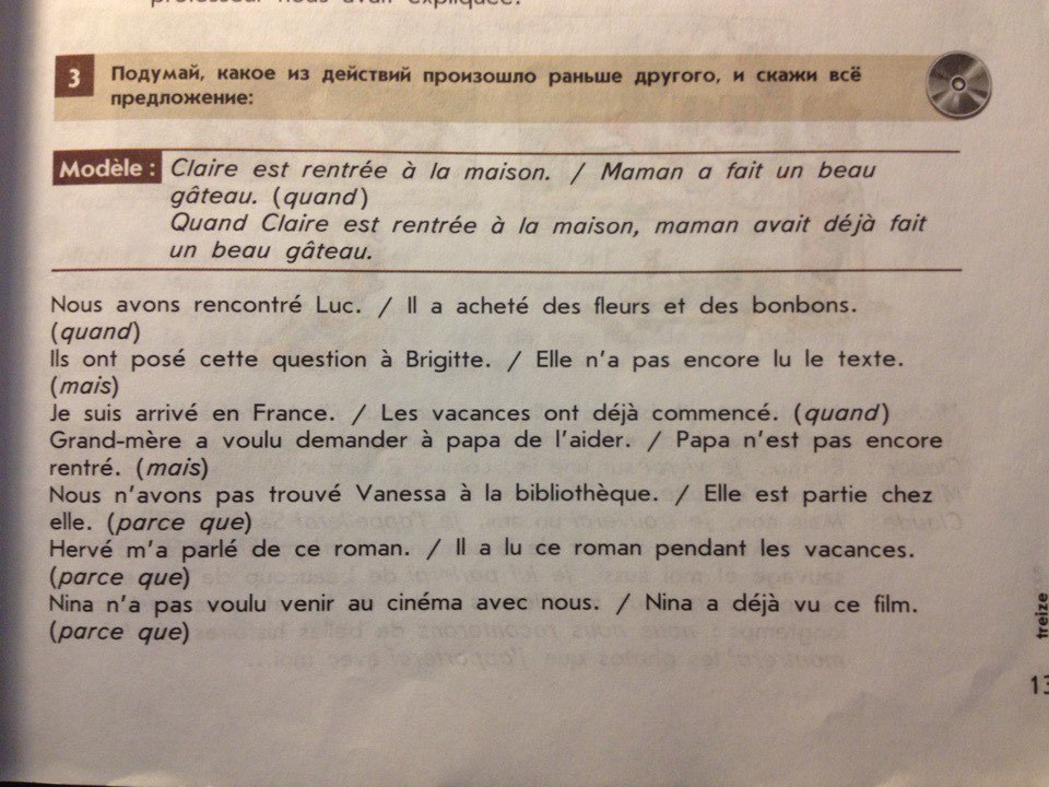 Мы встретили Люка. Он купил цветы и сладости. (когда) Они задали Бриджет этому вопросу. Она еще не прочла текст. (но) Я приехал во Францию Праздники уже начались (когда) Бабушка хотела попросить папу помочь ему. Папа еще не вернулся (но) Мы не нашли Ванессу в библиотеке. Она ушла из дома. (потому что) Эрве рассказал мне об этом романе. Он читал этот роман во время праздников. (потому что) Нина не хотела приезжать в кино вместе с нами. Нина уже видела этот фильм. (Поскольку)