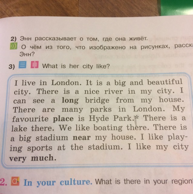 я живу в Лондоне. это большой и красивый город. в моём городе есть чудесная река. я могу смотреть с длинного моста до моего дома.в Лондоне есть много парков.моё любимое место это Хайд парк. в парке есть река. рядом с моим домом есть большой стадион. я люблю свой город очень сильно