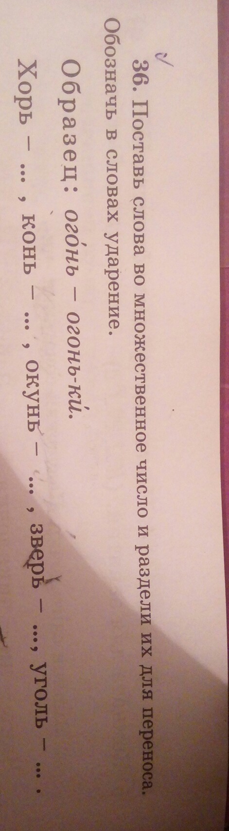 поставь слова множественное число и Раздели их для переноса обозначь в словах ударение . Окунь зверь уголь конь хорь
