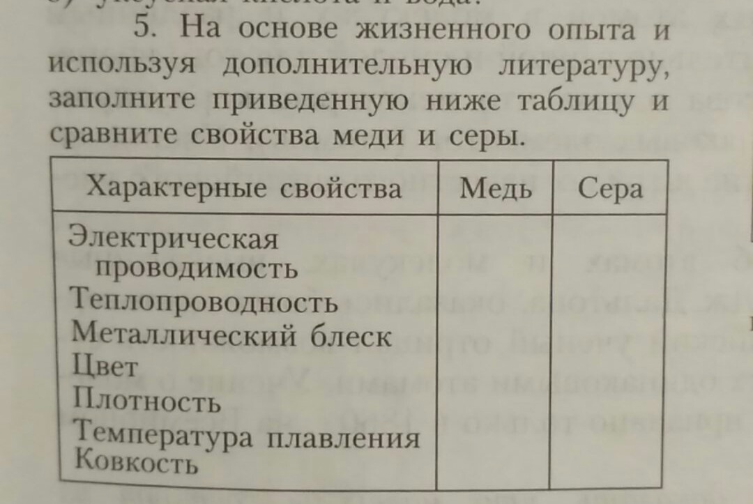 на основе жизненного опыта и Используя дополнительную литературу, Заполните приведенную ниже таблицу и сравните свойства меди и серы.
