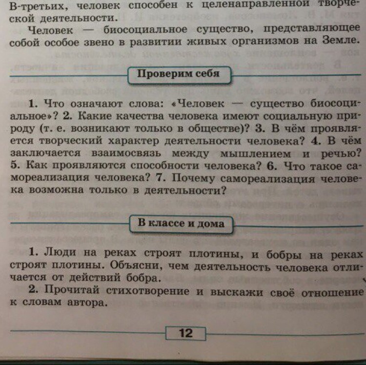 Каждый родившийся ребёнок становится человеком только в обществе. И человек из него вырастает только в семье, в обществе, где его учат жить, дают ему знания об окружающем мире, формируют умение трудиться. Будучи общественным (социальным) существом, человек не перестаёт быть существом природы. Природа создала тело человека. Социальное и биологическое слито в человеке воедино. Прямая походка, строение мозга, очертание лица, форма рук — всё это результат изменений, происходивших длительное время (миллионы лет). Каждый ребёнок обладает послушными его воле пальцами: он может взять кисть и краски, рисовать. Но стать живописцем он может только в обществе. У каждого родившегося есть мозг и голосовой аппарат, но научиться мыслить и разговаривать он может лишь в обществе. У каждого человека, как и у любого животного, есть инстинкт самосохранения.