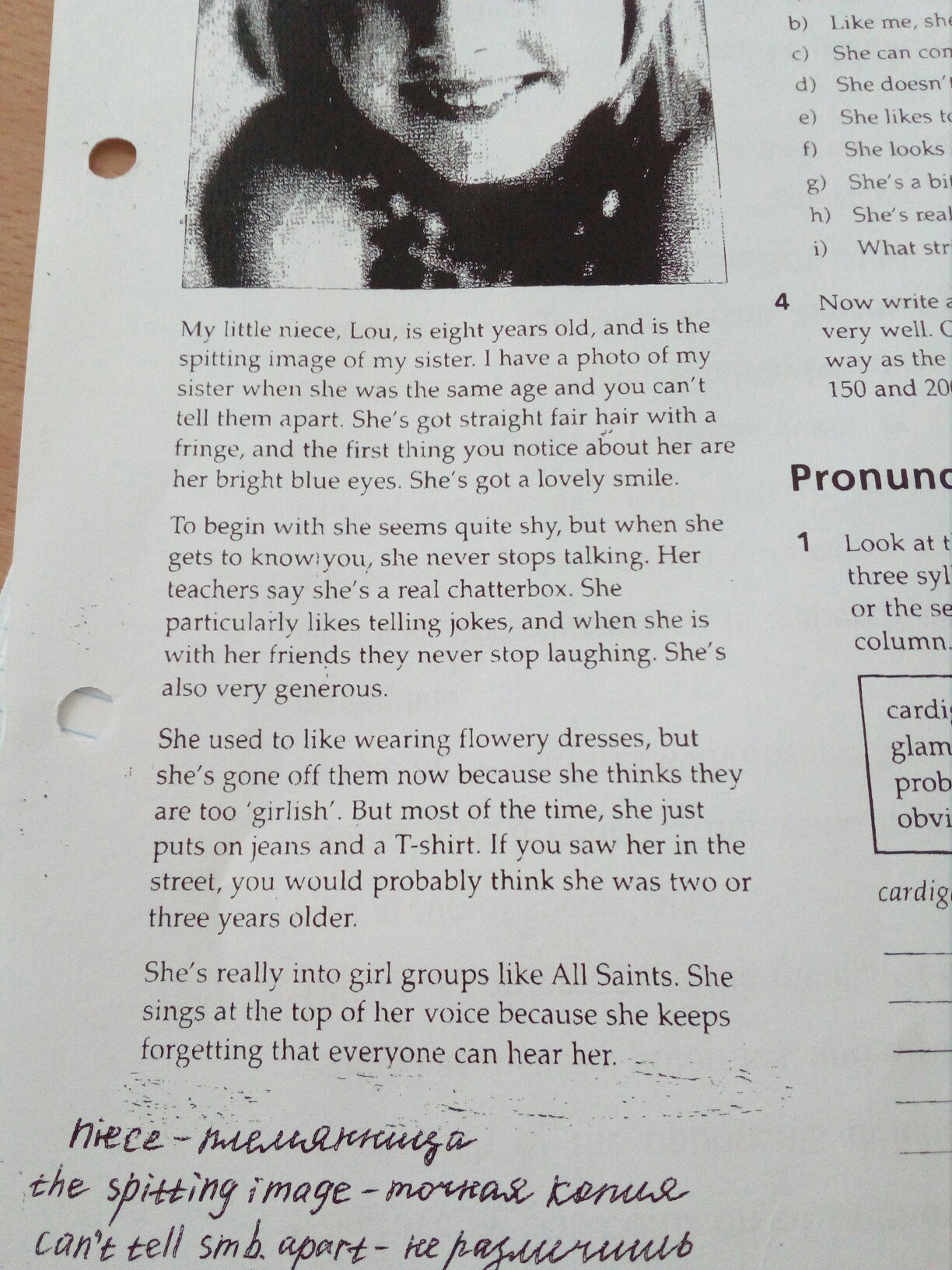 Моей маленькой племяннице Лоу 8 лет и она вылитый портрет моей сестры.У меня есть фото моей сестры, когда ей было столько же лет и их не различить.У неё прямые светлые волосы с чёлкой и первое, что вы замечаете в ней,это её ярко-голубые глаза.У неё красивая улыбка.