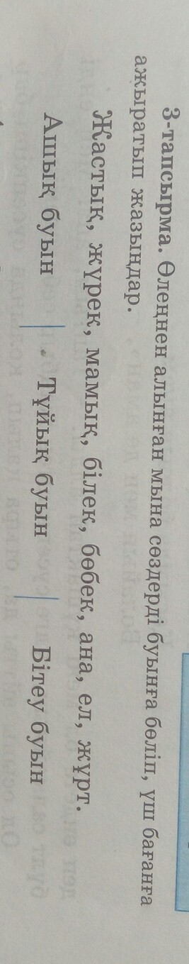 Жас(бітеу)-тық(бітеу),жұрт(бітеу),жү(ашық)-рек(бітеу),ма(ашық)-мық(бітеу),бі(ашық)-лек(бітеу),бө(ашық)-бек(бітеу),а(тұйық)-на(ашық),ел(тұйық)